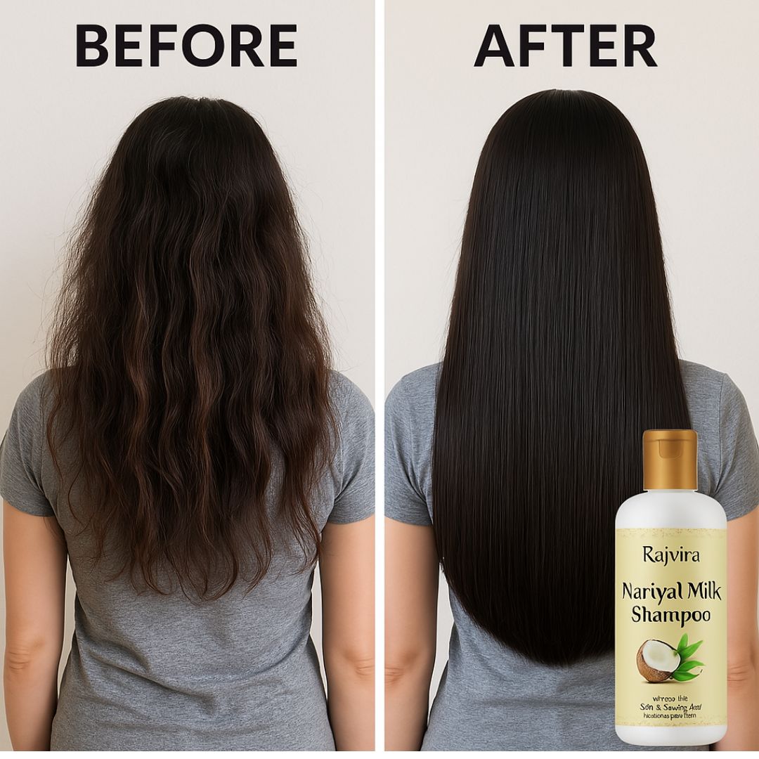 રાજવીરા નાળિયેર મિલ્ક શેમ્પૂ: નિયમિત ઉપયોગથી વાળ થશે – ઘના, નરમ, ચમકદાર અને કુદરતી રીતે સ્વસ્થ! 🌿